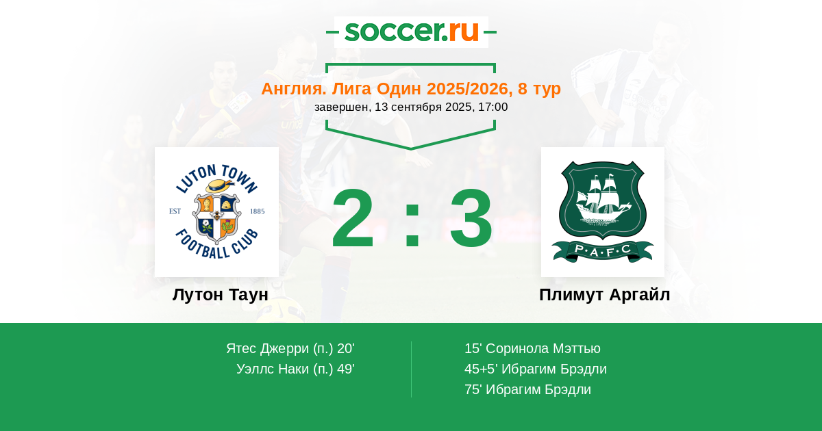 Лутон Таун - Плимут Аргайл: обзор матча 13 сентября 2025