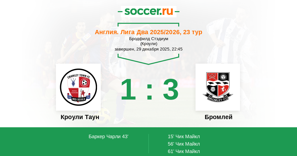 Кроули Таун - Бромлей: обзор матча 29 декабря 2025