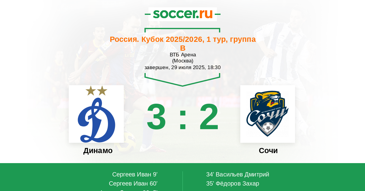 Думаю, что никакой недооценки Кубка и расстановки приоритетов в пользу РПЛ не будет. Склоняюсь к уверенной виктории “Динамо”. У “Сочи”, судя по первым турам РПЛ, игра отсутствует от слова совсем.