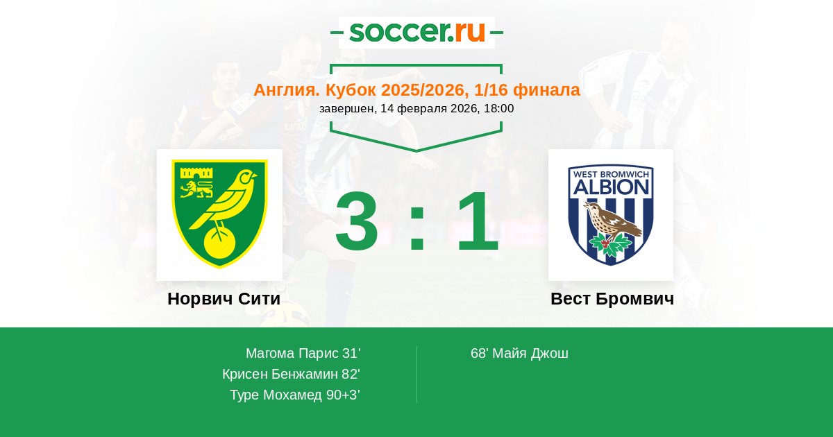 Норвич Сити - Вест Бромвич: обзор матча 14 февраля 2026