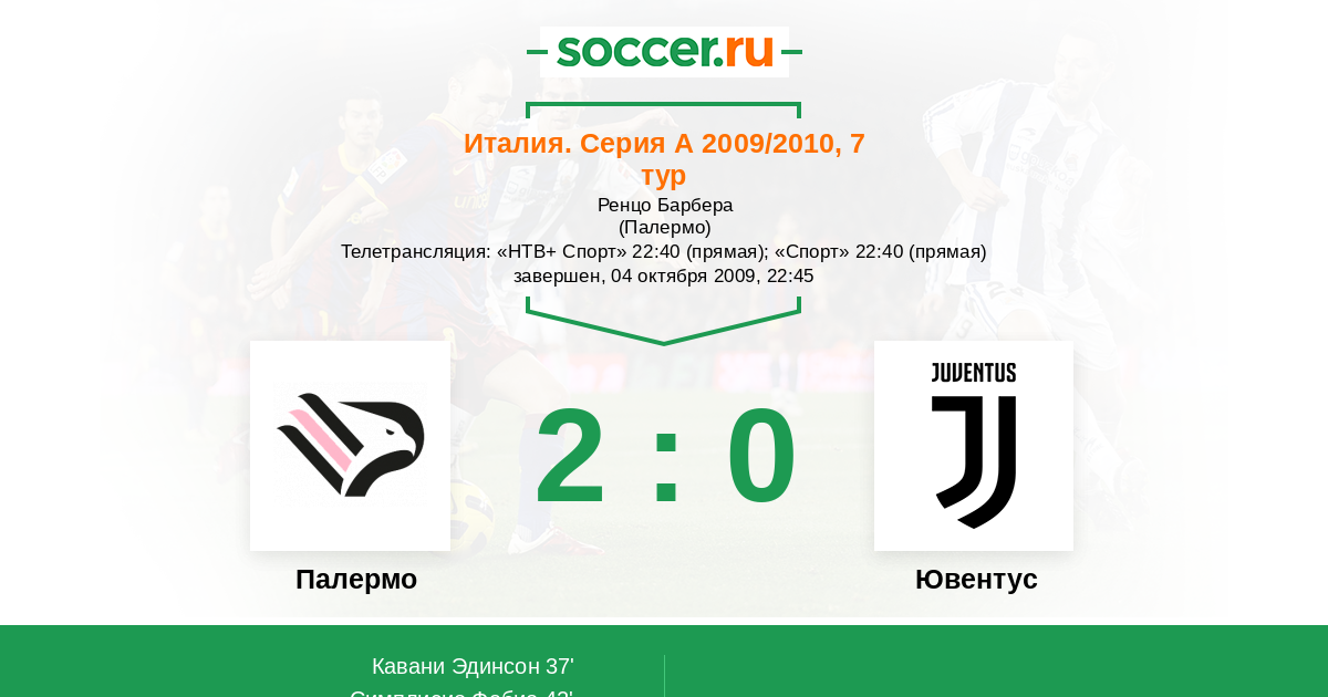 Палермо, Ренцо Барбера Телетрансляция: "НТВ+ Спорт" 22:40 (прямая); "Спорт" 22:40 (прямая)