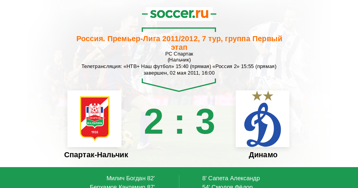 Нальчик, РС Спартак Телетрансляция: "НТВ+ Наш футбол" 15:40 (прямая) "Россия 2" 15:55 (прямая)