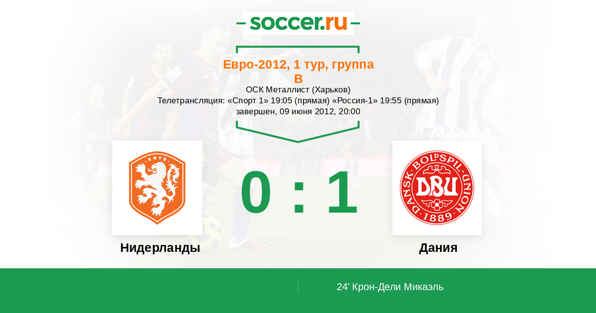 Мы приветствуем Вас на стартовом матче в группе В Евро-2012. Сборная Голландии будет экзаменовать национальную команду Дании. Прямую текстовую трансляцию проведет комментатор Soccer.Ru Антон Сазонтов. Добро пожаловать!