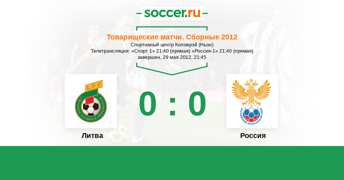 Добрый вечер, уважаемые посетители нашего портала! Сегодня в Ньоне на стадионе "Коловрей" сборная России проведет предпоследний товарищеский матч в преддверии Евро-2012. В соперниках - сборная Литвы. Прямую текстовую трансляцию для Вас проведет комментатор Soccer.Ru Антон Сазонтов. Добро пожаловать!