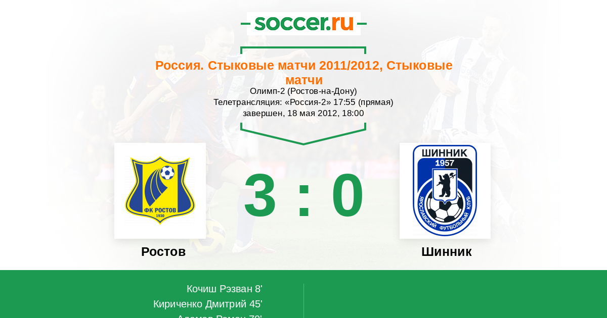 Мы приветствуем Вас на первом переходном матче за право участия в первенстве Премьер-лиги в следующем сезоне. Встречаются "Ростов" и "Шинник". Прямую текстовую трансляцию проведет комментатор Soccer.Ru Антон Сазонтов. Добро пожаловать!