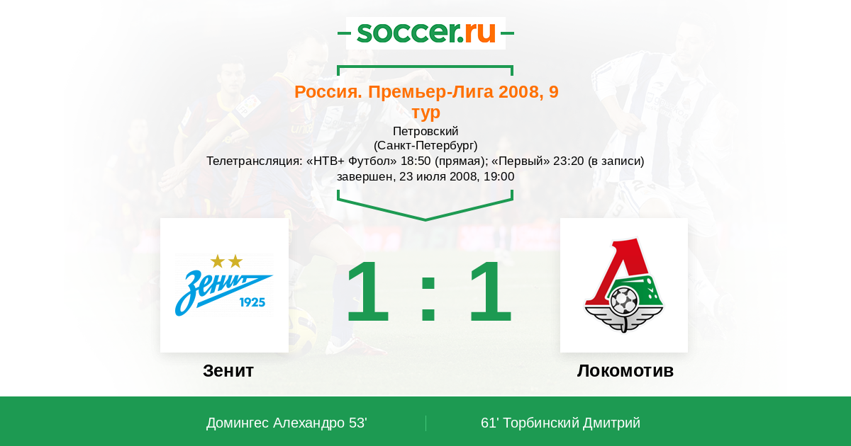 Санкт-Петербург, Петровский Телетрансляция: "НТВ+ Футбол" 18:50 (прямая); "Первый" 23:20 (в записи)