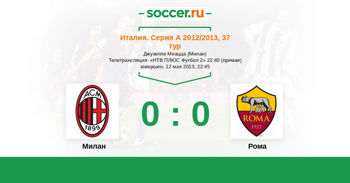 Мы приветствуем Вас на матче 37-го тура итальянской Серии А, в котором "Милан" принимает "Рому". Прямую текстовую трансляцию проведет комментатор Soccer.Ru Антон Сазонтов. Добро пожаловать!