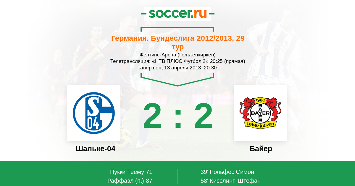 Мы приветствуем Вас на матче 29-го тура немецкой Бундеслиги, в котором "Шальке-04" принимает "Байер". Прямую текстовую трансляцию проведет комментатор Soccer.Ru Антон Сазонтов. Добро пожаловать!