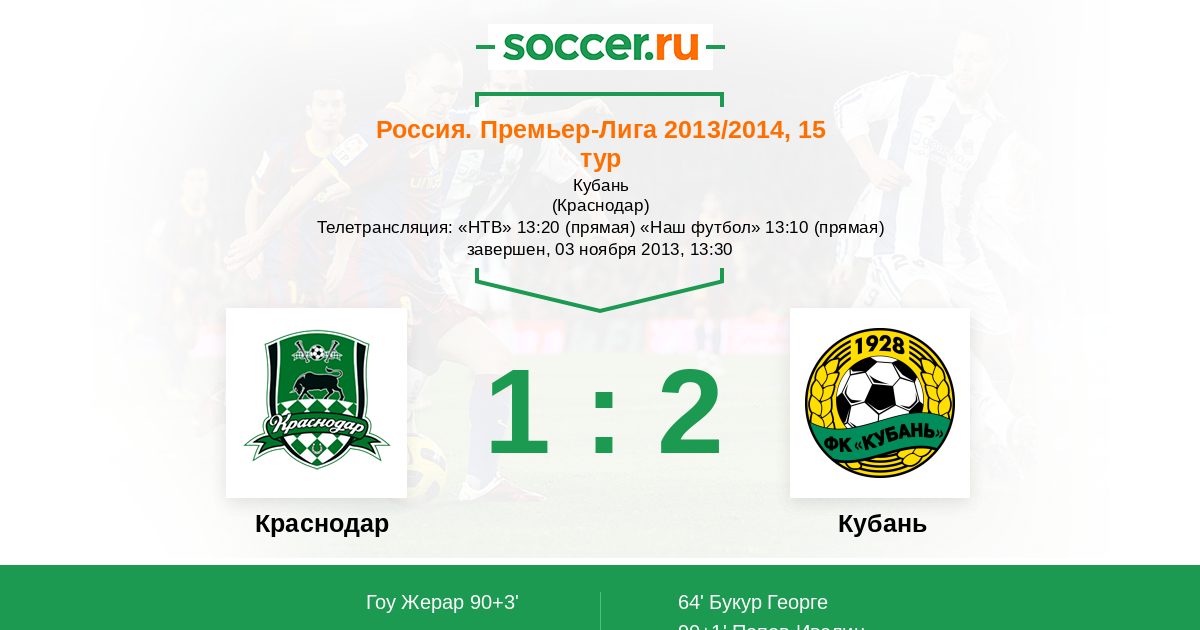 Краснодар, Кубань Телетрансляция: "НТВ" 13:20 (прямая) "Наш футбол" 13:10 (прямая)