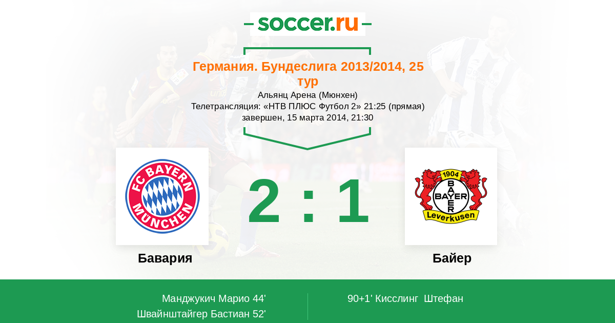 Мюнхен, Альянц Арена Телетрансляция: "НТВ ПЛЮС Футбол 2" 21:25 (прямая)