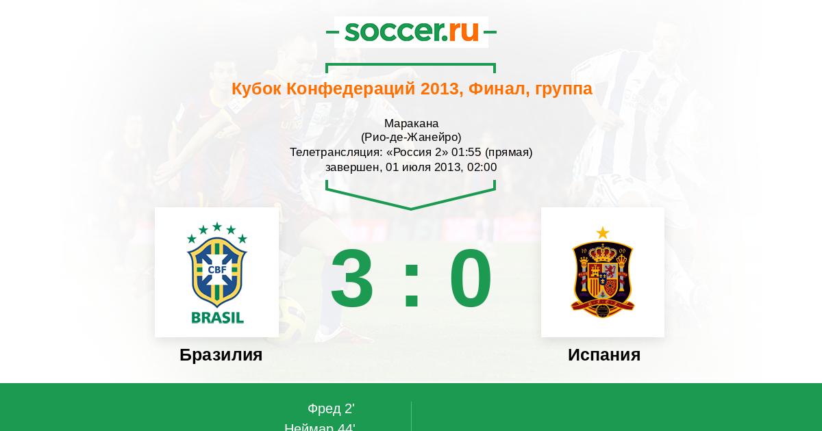 Халк, здорово поборовшись за мяч с Альбой, из центральной зоны сделал классный пас в направлении Неймара, тот остроумно пропустил мяч на Фреда, который с 12 метров нанес точнейший обводящий удар в дальний нижний угол. Касильяс в прыжке кончиками пальцев сумел дотянуться до мяча, но не смог помешать ему влететь в ворота.
