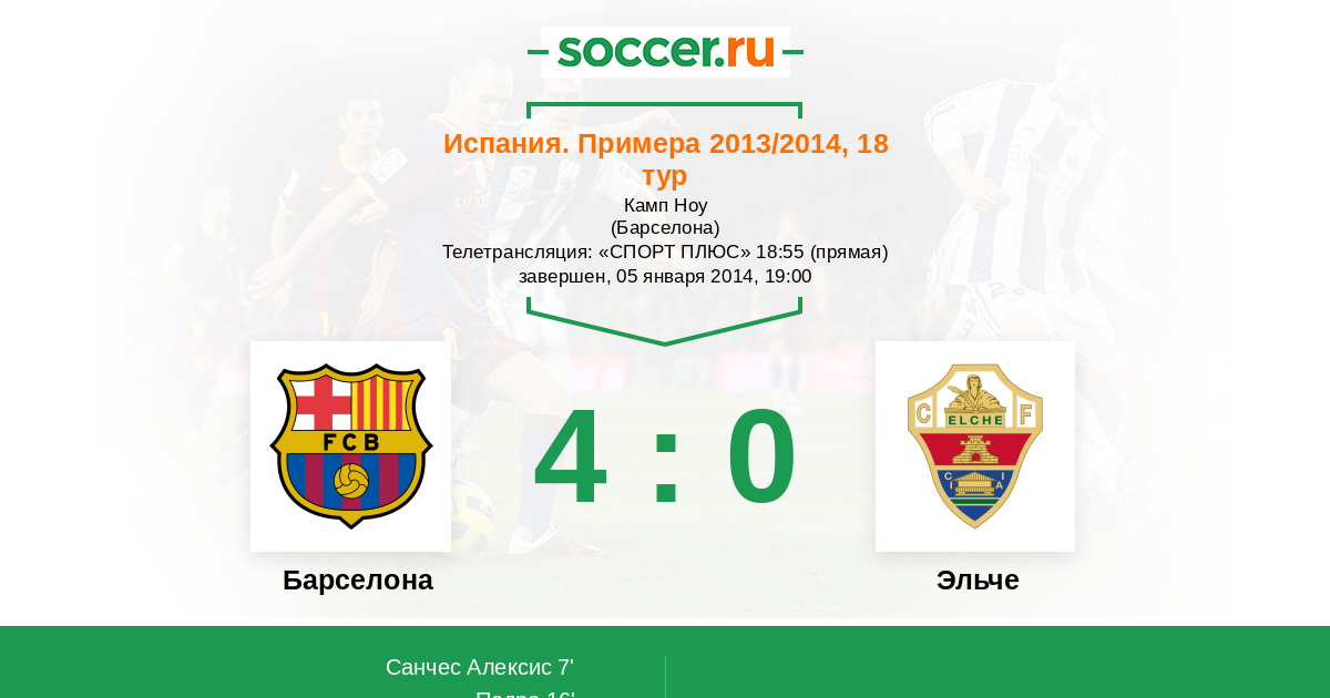 Мы приветствуем Вас на матче 18-го тура испанской Ла Лиги, в котором "Барселона" принимает "Эльче". Прямую текстовую трансляцию проведет комментатор Soccer.Ru Антон Сазонтов. Добро пожаловать!