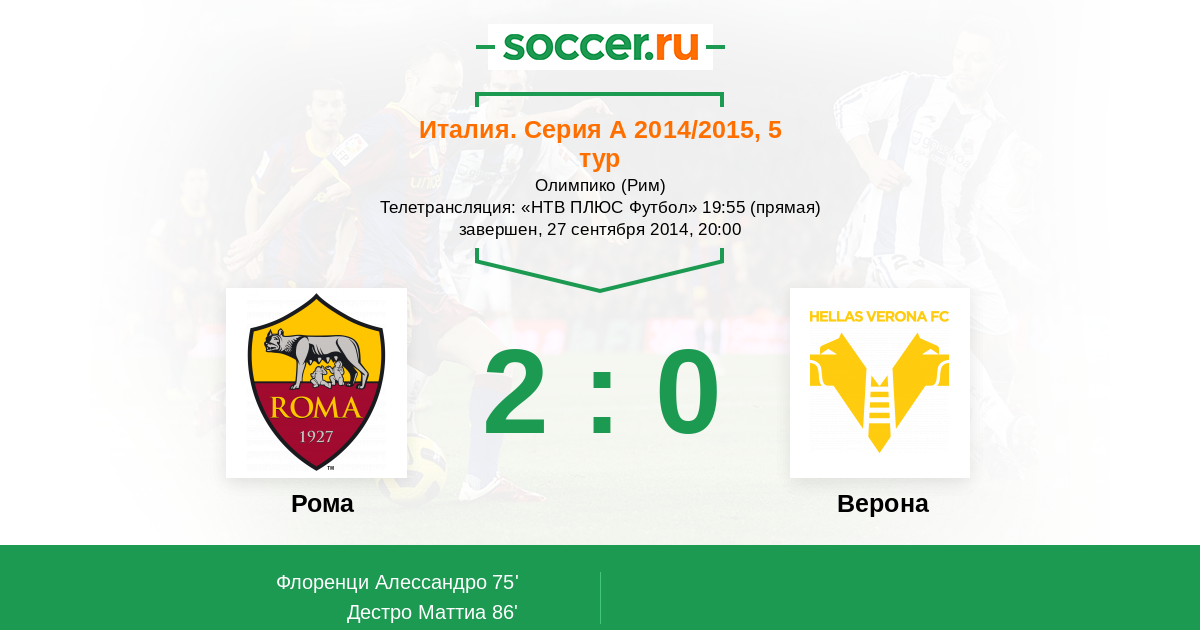 Рим, Олимпико Телетрансляция: "НТВ ПЛЮС Футбол" 19:55 (прямая)