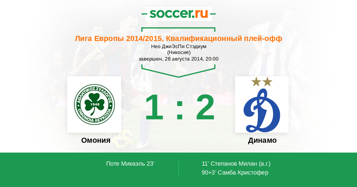 Мы приветствуем Вас на ответном матче раунда плей-офф Лиги Европы, в котором "Динамо" пожалует в гости к "Омонии". Прямую текстовую трансляцию проведет комментатор Soccer.Ru Антон Сазонтов. Добро пожаловать!