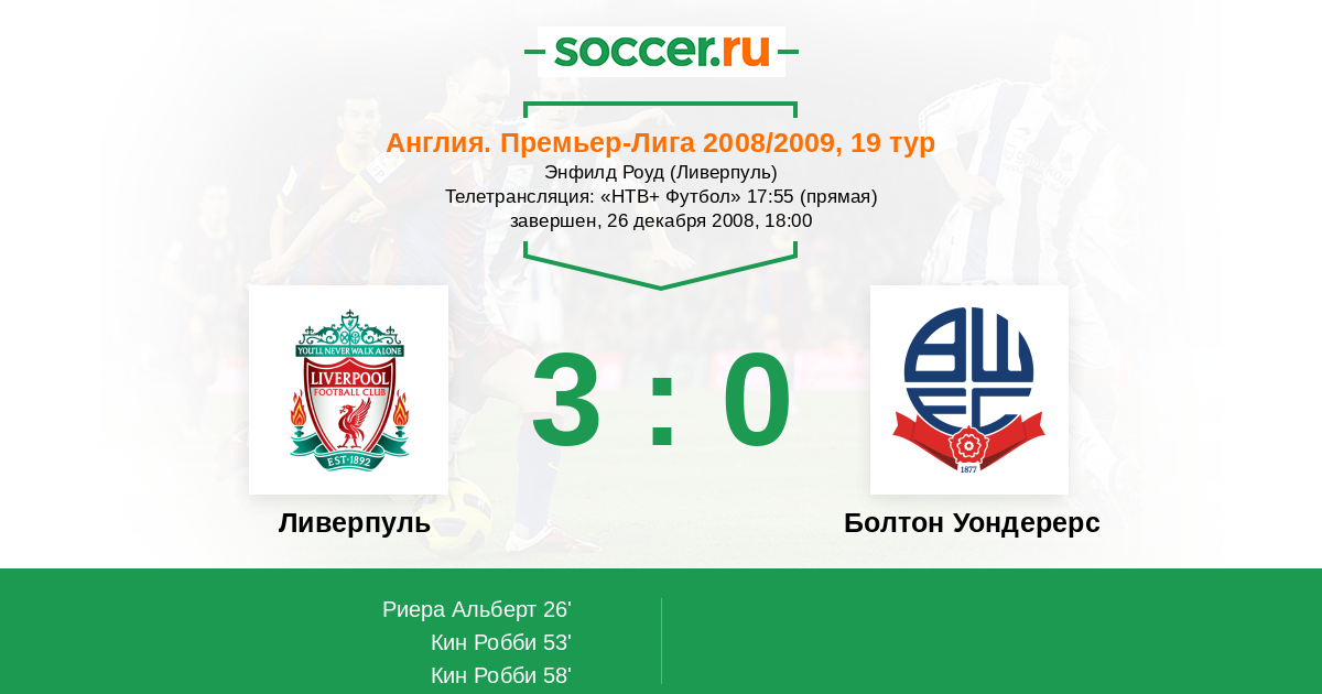 Ливерпуль, Энфилд Роуд Телетрансляция: "НТВ+ Футбол" 17:55 (прямая)