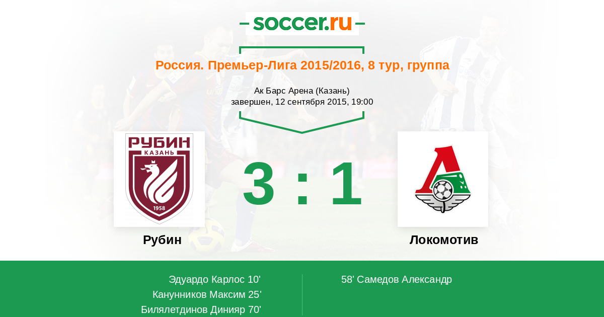 Мы приветствуем Вас на матче 8-го тура российской Премьер-лиги, в котором "Рубин" принимает "Локомотив". Прямую текстовую трансляцию для Вас проведет комментатор Soccer.Ru Антон Сазонтов. Добро пожаловать!