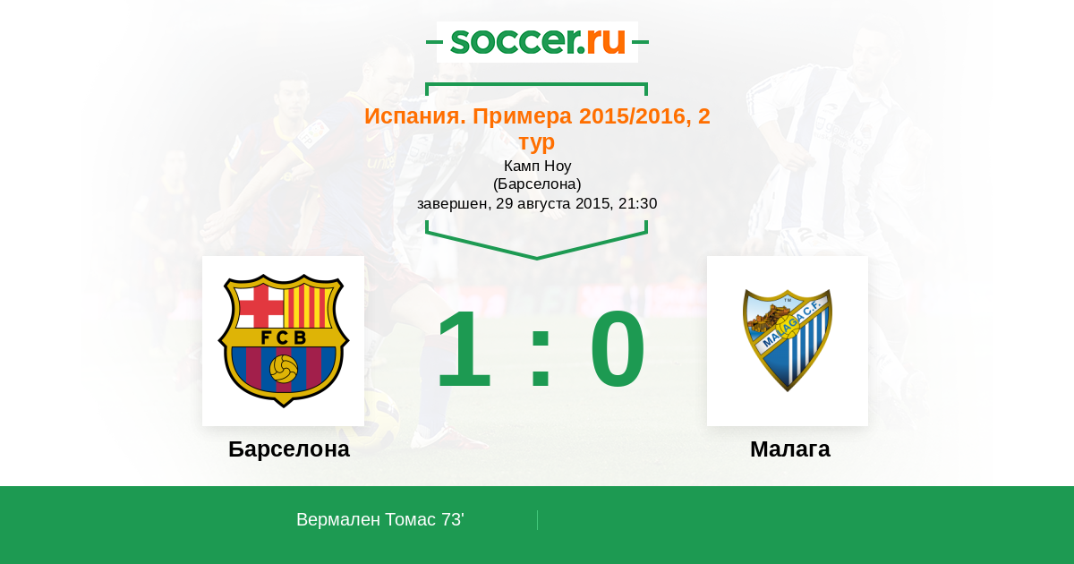 Добрый вечер, уважаемые любители футбола! Предлагаем Вашему вниманию текстовую трансляцию матча 2-го тура Ла Лиги, в котором "Барселона" принимает "Малагу". Прямую текстовую трансляцию для Вас проведет комментатор Soccer.Ru Антон Сазонтов. Добро пожаловать!