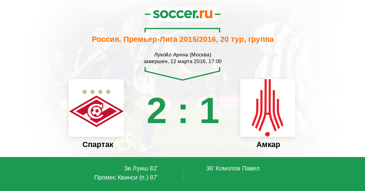 "Спартак" одерживает победу! Хотя по игре "Амкар" отлично смотрелся и большую часть времени отлично защищался. Замены Дмитрия Аленичева поменяли ход игры. Зе Луиш забил гол и заработал победный пенальти, который реализовал Квинси Промес. Джано и Зуев также участвовали в первой голевой атаке. "Красно-белые" на данный момент выходят на третье место в чемпионате. А мы завершаем нашу трансляцию на soccer.ru и предлагаем традиционно выставить оценки всем действующим лицам на поле http://www.soccer.ru/matches/ratings/986074.shtml.