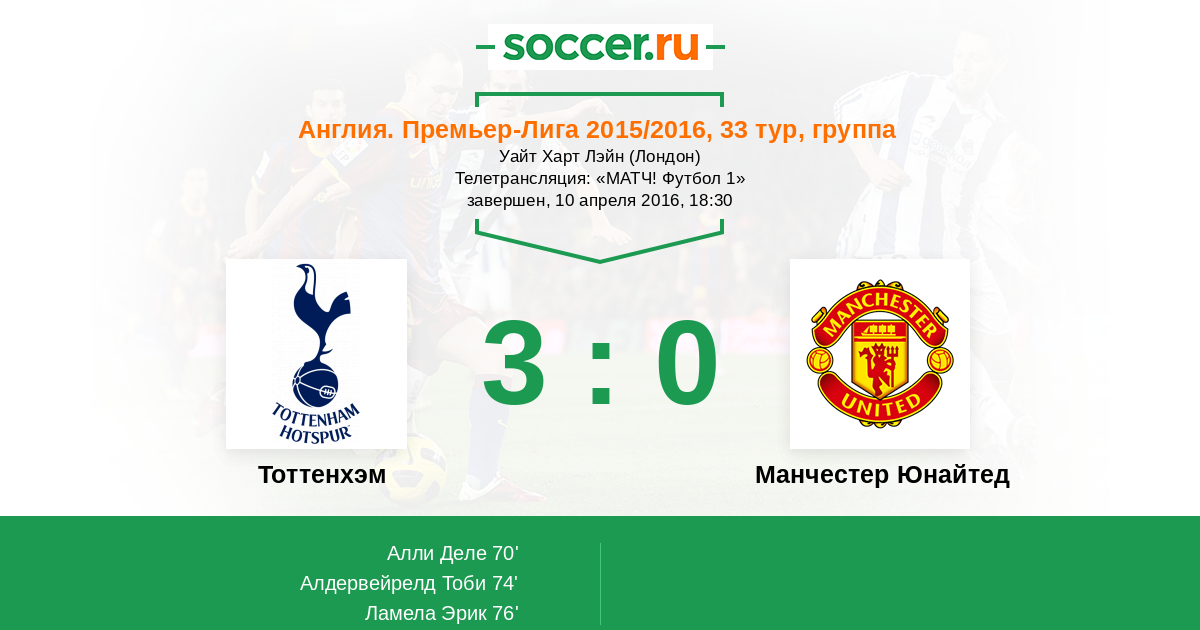 Добрый вечер, уважаемые любители футбола! Сегодня в рамках 33-го тура английской Премьер-Лиги встретятся "Тоттенхэм" и "Манчестер Юнайтед". Если подопечные Маурисио Почеттино продолжают погоню за идущем на первом месте "Лестером", то "красные дьяволы" все пытаются отчаянно зацепиться за путевку в Лигу Чемпионов. Матч первого круга между этими командами завершился минимальной победой манкунианцев, голом в свои ворота отметился Кайл Уокер. Результат сегодняшнего матча на "Уайт Харт Лэйн" невозможно предугадать, но можно точно сказать, что на поле сегодня будет жарко! Вместе с вами следить за событиями этой интригующей встречи на http://www.soccer.ru будет Дмитрий Отмахов.