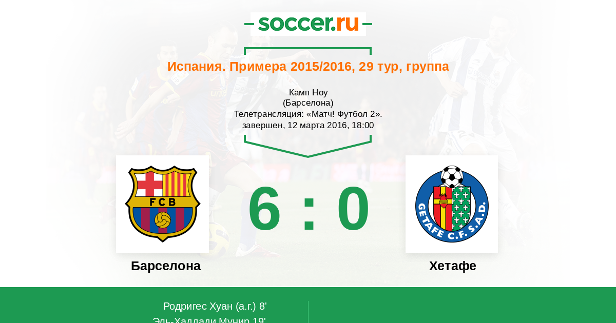 Добрый вечер любители футбола! Субботнюю программу матчей 29-го тура испанской Ла Лиги откроет поединок на "Камп Ноу" между единоличным лидером чемпионата, "Барселоной" и одним из аутсайдеров - "Хетафе". В последнее время команда из пригорода Мадрида стала для каталонцев не самым приятным соперником, почти каждый сезон "Хетафе" удаётся отбирать очки у сине-гранатовых. Как правило, перед матчами наподобие "Барселона" - "Хетафе" главная интрига заключается в том, сколько забьют каталонцы. Сайт http://www.soccer.ru проведёт прямую текстовую онлайн трансляцию матча, комментировать игру будет Старчеус Сергей.