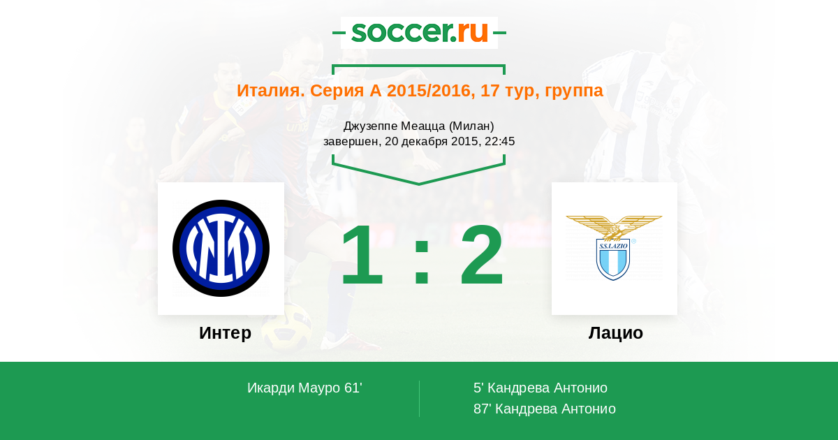 0' Добрый вечер! Мы в Милане. Увы, только фигурально. Но это ничуть не помешает насладится матчем двух традиционно мощных итальянских команд - "Интера" и "Лацио". У вторых, правда, дела идут неважно. Римляне за вторую половину осени прилично упали в таблице. Двенадцатое место. Вряд ли с таким составом подобное положение может устраивать. Зато у "нерадзурри" полный порядок. Оступившийся "Наполи" освободил им первое место. Даже поражение в очном поединке не помешало его занять чуть позже. Однако сегодня уже у миланцев есть реальный шанс допустить ошибку. Последний тур перед перерывом. Самое время выкладываться по полной. Особенно командам из второй половины таблицы. Будет на что посмотреть. Даже если нет - всё равно ведь вы потом соскучитесь по Серии А. Так что самое время смотреть матчи не отрываясь. А комментировать игру для вас будет Николай Самофалов.