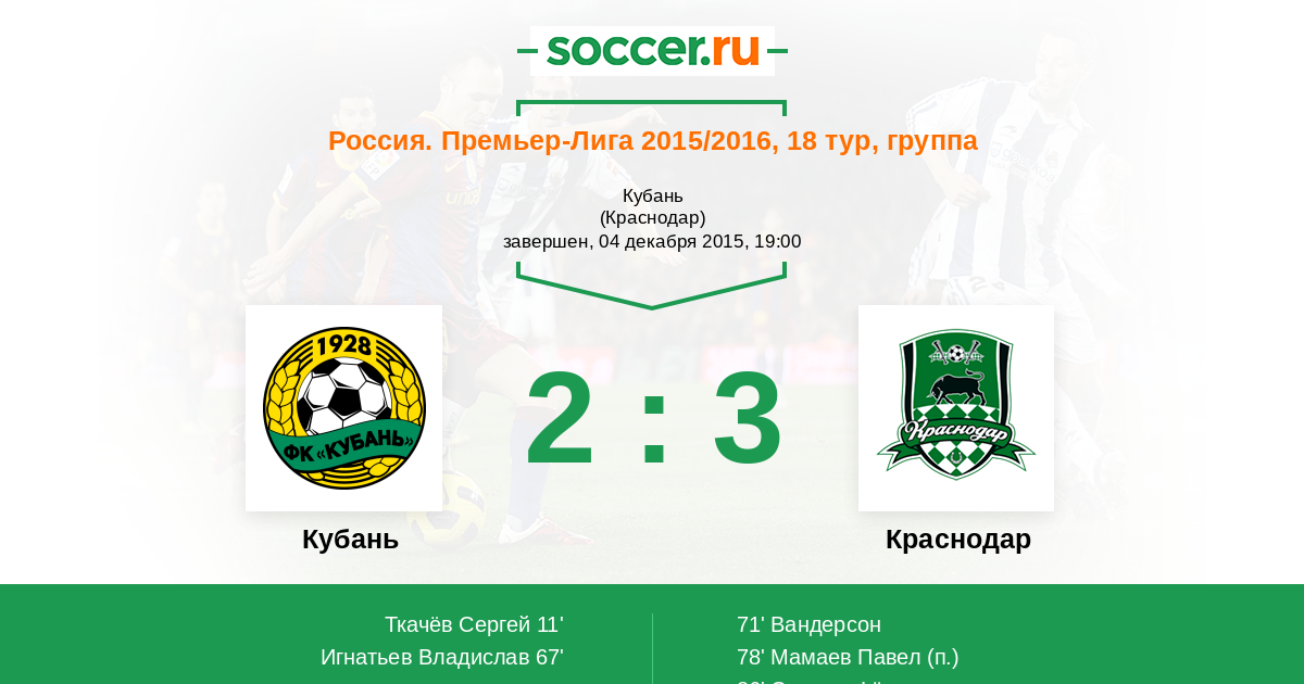 Добрый вечер всем любителям футбола! Сайт Soccer.ru проведёт сегодня прямую текстовую онлайн трансляцию матча чемпионата России по футболу. В Краснодаре на стадионе "Кубань", в рамках 18-го тура ФК "Кубань" принимает ФК "Краснодар". Комментировать матч для Вас будет Старчеус Сергей.