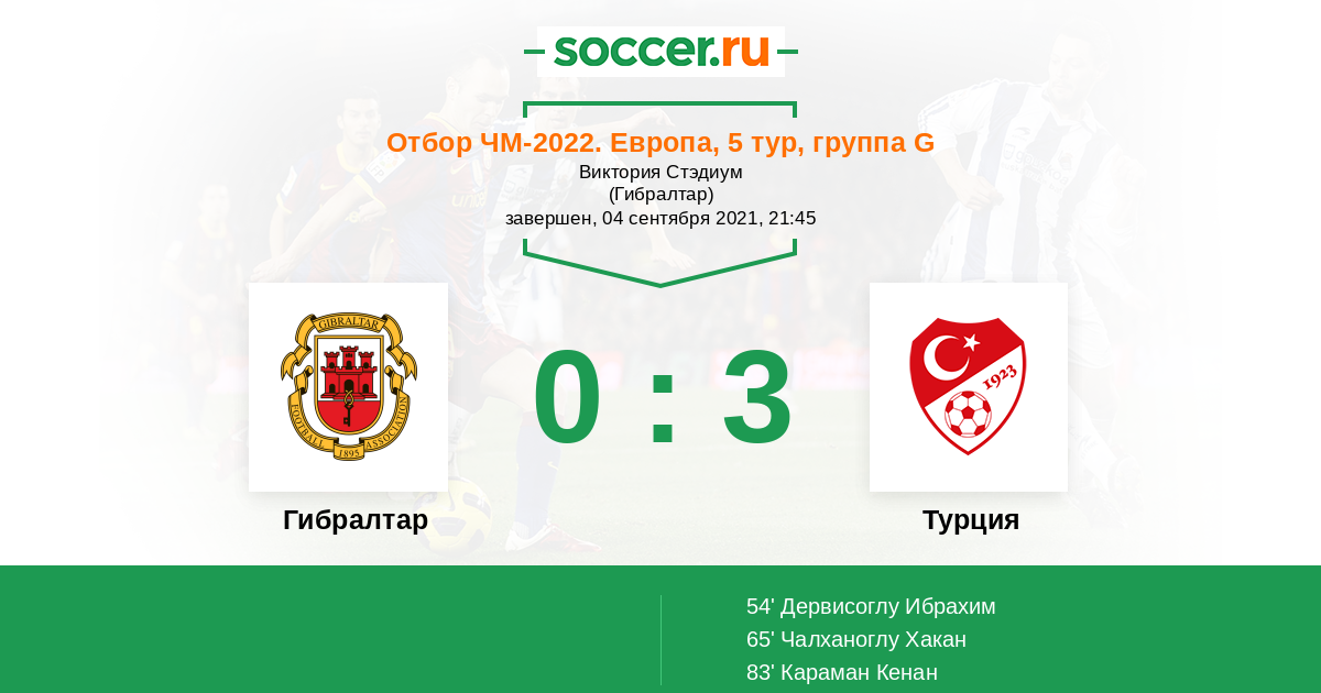 В составе сборной Турции будет отсутствовать защитник "Лестера" Чалар Сёюнджю, так как клуб не отпустил игрока из-за коронавирусных ограничений. Больше серьёзных потерь у обоих оппонентов нет. Матч с черногорцами Турция начала очень мощно, забив два мяча в первом тайме, что подтверждает – атака команды жива и со сборной Гибралтара она должна разбираться. Серия из пяти матчей без побед сильно давит на турков, для которых идеальным выходом из затянувшегося пике будет победа над гибралтарцами, расположившимися на 194-й строчке рейтинга ФИФА.
