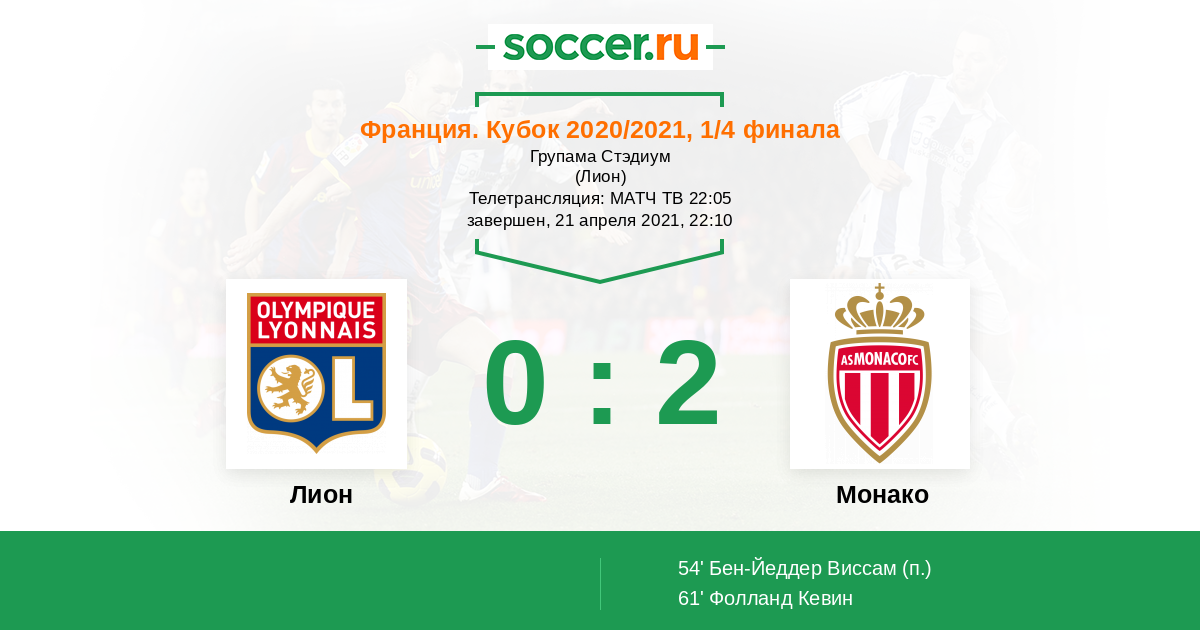 Смотришь на табло, видишь 0:2 . Смотрел матч, в первом тайме должно было быть минимум 3:0 . Парадоксальные вещи случаются в футболе. И если бы в первом тайме Лион забил хотя бы один мяч, игра наверное сложилась совсем по другому сценарию , тем более что у Монако в первом тайме не получалось ,от слова, - совсем, ничего. Но футбол видимо тем и хорош, что мяч круглый, поле прямоугольное , а счёт на табло может быть не предсказуем !!! Тому доказательство сегодняшний матч, где в первом тайме доминировали Лион не сумев забить все свои моменты, и второй тайм ,где красные карточки и осознание того что можно проиграть кубковй матч ,Монако сделали то что должны были сделать. Итоговый счёт на табло где Монако вышел победителем !!! С Победой Головин и К° !!! Всем Добра !!!