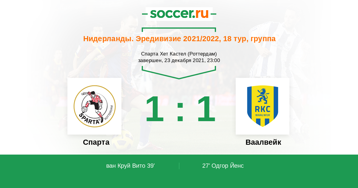 В матче двух аутсайдеров лиги зрители увидят много борьбы но вряд ли будет много голов. Спарта в среднем забивает меньше гола за игру, Ваалвейк чуть больше гола за игру. Скорее всего здесь будет ничья. 1:1