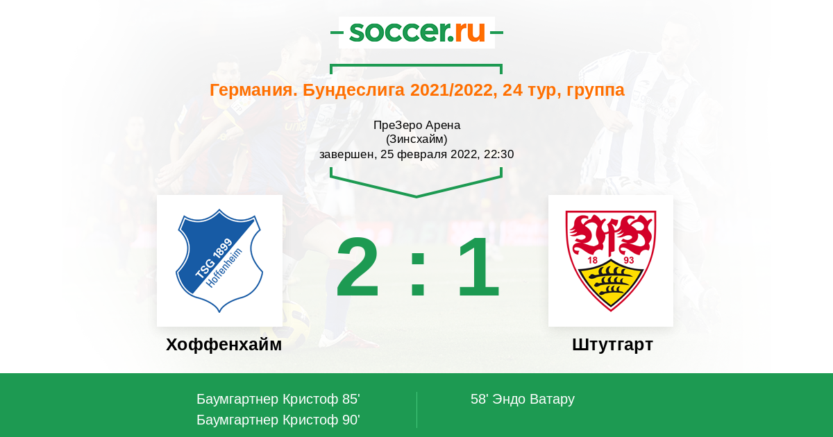 “Деревенские” наконец-то сумели преодолеть неудачный период, когда команда потерпела четыре поражения кряду. В последних двух турах подопечные Себастьяна Хёнесса одержали две победы, вернувшись в гонку за место в Лиге чемпионов. У “швабов” пресловутый неудачный период продолжается до сих пор: восемь матчей без побед, шесть из них - поражения и предпоследнее место в таблице.