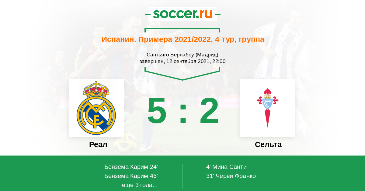 А вот у соперника "Сливочных" дела сильно хуже: "кельты" безобразно начали розыгрыш Примеры, они и близко не показывают той игры, которая была на финише сезона-2020/21. У "Сельты" проблема не только с нападением (один гол в трёх матчах), но и с обороной (три пропущенных). На выезде команда Эдуардо Куде играет очень плохо, так что ничего противопоставить супермотивированному "Реалу" она не сможет. Наиболее вероятным исходом будет поражение "Сельты" в два мяча, именно так заканчивались пять из последних шести очных встреч этих команд.