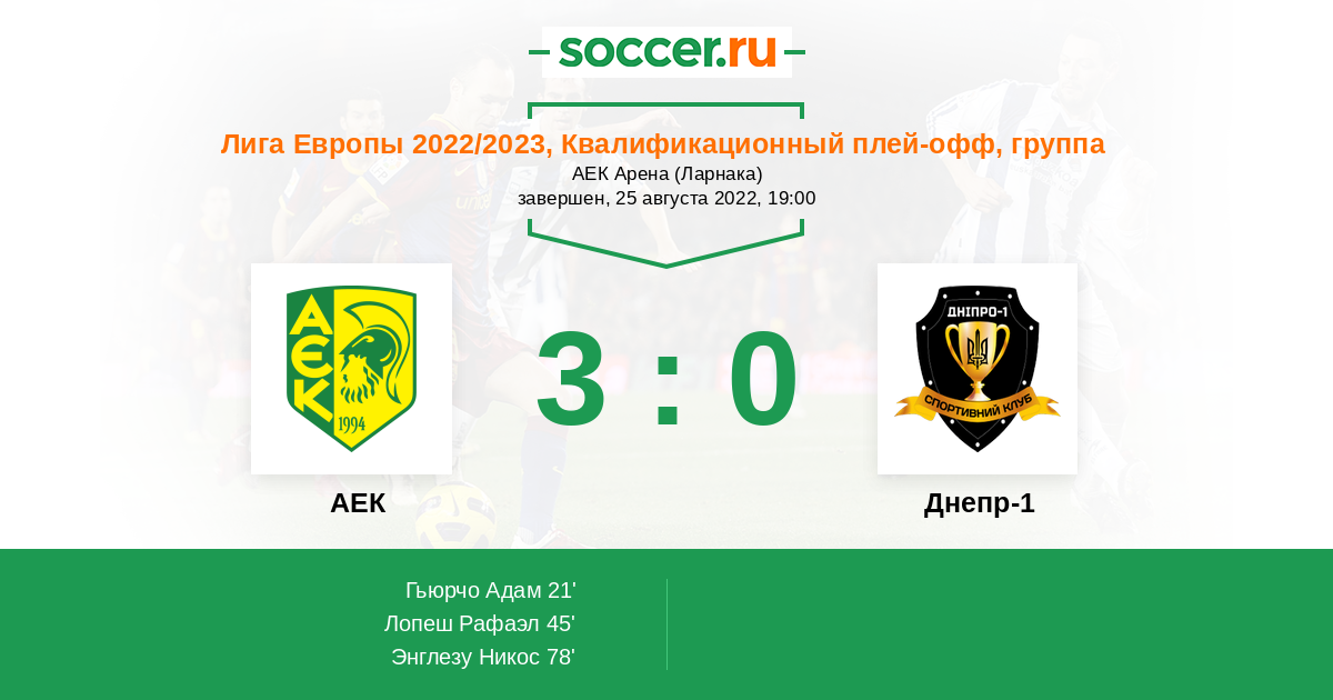 В этом матче фаворитом являются команда хозяев поля. АЕК Ларнака имеет у себя в составе не плохой подбор легионеров которые и делают результат, в первом матче в гостях они смогли выиграть. Вообще и до противостояния с Днепром у АЕКа были сильные соперники это Мидтьюланд в Лиге чемпионов где они проиграли лишь в дополнительное время и Партизан в Лиги Европы которой они смогли пройти и везде они забивали голы, и это говорит о том что команда не сидит в обороне. Прогноз, обе команды забьют. Удачи