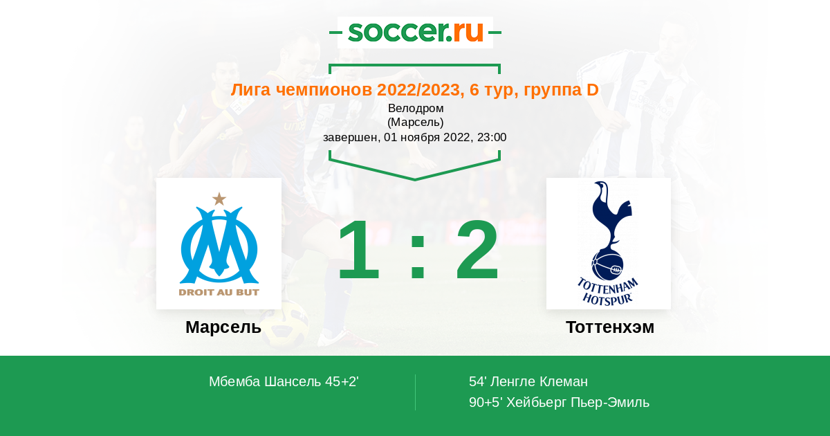 В предстоящем матче 6 - го тура группового этапа Лиги Чемпионов УЕФА между командами Марсель и Тоттенхэм Хотспур , моим фаворитом на победу является команда гостей Тоттенхэм Хотспур , а возможно, что и ничья.