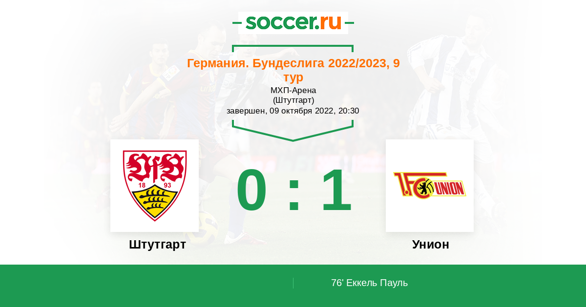 Тяжелый матч для обеих команд. Унион добился результата, но видно, как непросто дается набор очков. Уже ощущается нехватка хороших запасных и кажется скоро берлинцы опустятся на более привычные позиции. Но пока достигают максимума при ограниченных ресурсах. После этого матча уместно вспомнить старую классику: "Игра забудется, а результат останется".  Штутгарт даже оставшись в меньшинстве, сумел потрепать нервы соперников в концовке и провел достойный навал. Надеюсь останутся в высшей лиге.