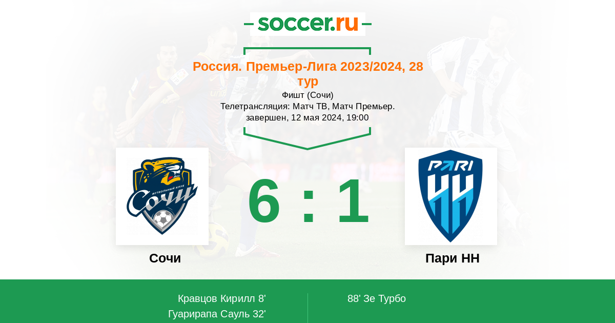 при Иличе “Пари НН” начнет набирать очки. Смена тренера всегда дает импульс. По “Сочи” скажем коротко: 8 очков от зоны переходных за 3 тура до конца сезона практически приговорили команду к вылету. Да, на старте весенней части сезона южане выглядели действительно здорово, только ленивый не пел дифирамбы в пользу Морено, но в последнее время команда сбавила обороты. “Сочи” не выигрывает 4 матча кряду, причем в 3 случаях на этом отрезке встречался с прямыми конкурентам в борьбе за выживание — “Факел” (0:0), “Урал” (2:2) и “Ахмат” (0:1).