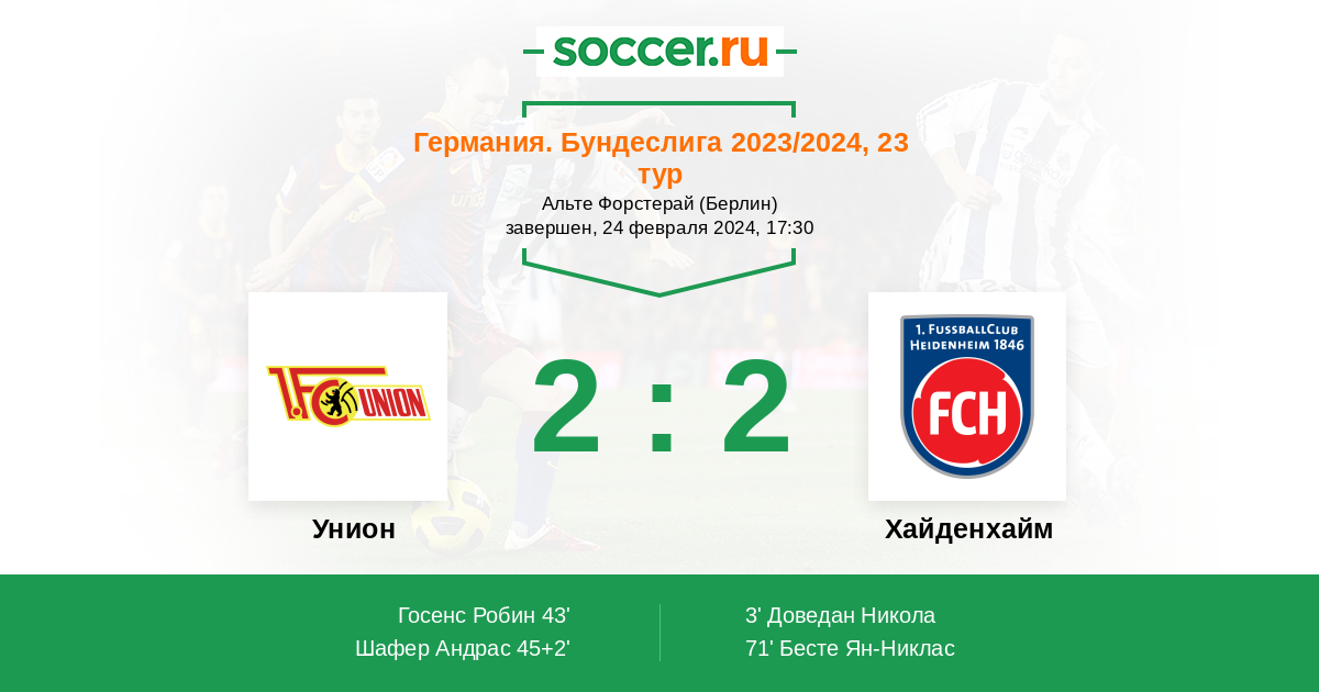 Унион - Хайденхайм ! Командам в этом сезоне в принципе не чего не " светит ". А вот опустится вниз по турнирной таблице ещё как можно . Надеюсь немецкий прагматизм возобладает . Х.