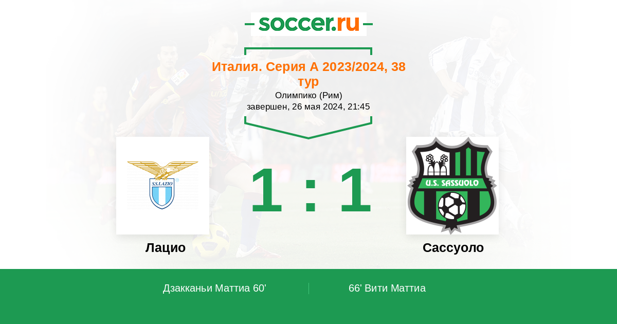 Лацио почти гарантировал себе участием в Лиге Европы... римлянам достаточно набрать всего одно очко в игре против уже вылетевшего Сассуоло. Четыре последних матча против этого соперника в рамках итальянского чемпионата завершились победой орлов. Случится ли пятая подряд победа Лацио в данном противостоянии?