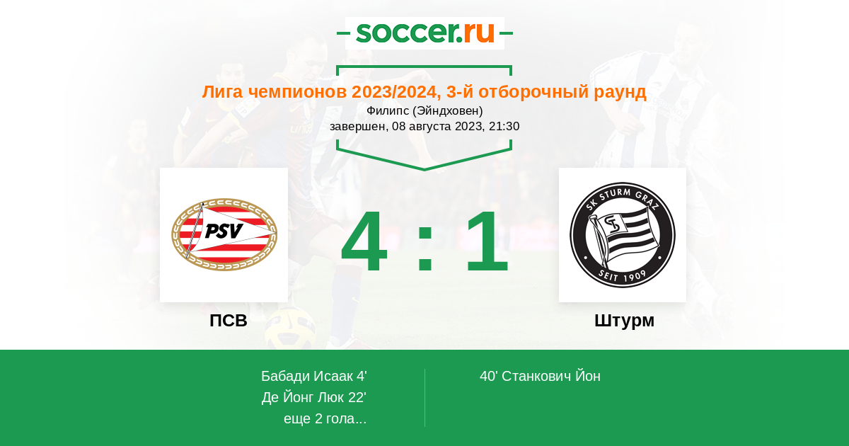 Не так давно, 1.5 года назад, ПСВ Эйндховен и Штурм Грац уже пересекались между собой на интернациональном поприще - в рамках группового этапа Лиги Европы УЕФА. И тогда в обоих случаях "филипсы" оказались значительно сильнее "штурмовиков", соответственно с итогами 2:0 и 4:1. Таким образом жду и на этот раз успех голландского гранда, возможно, и с минусовой форой!