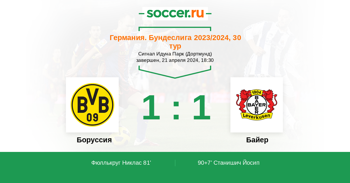 Байер будут иметь лишь одну мотивацию - продлить беспроигрышную серию. Все остальные задачи решены наилучшим образом. Думаю, Боруссия выиграет. Дортмунд имеет более высокий стимул, чем просто не проиграть очередную игру. Увренная победа 3-1