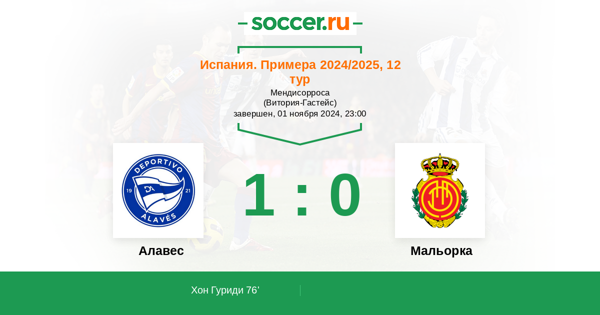 Мальорка очень сильно стартовала, фактически прыгнула гораздо выше своей головы. Да и везло им постоянно. А вот Алавесу очень нужны очки, тем более, что играют они дома. Три очка не получится взять, а вот одно вполне. Счёт 1:1