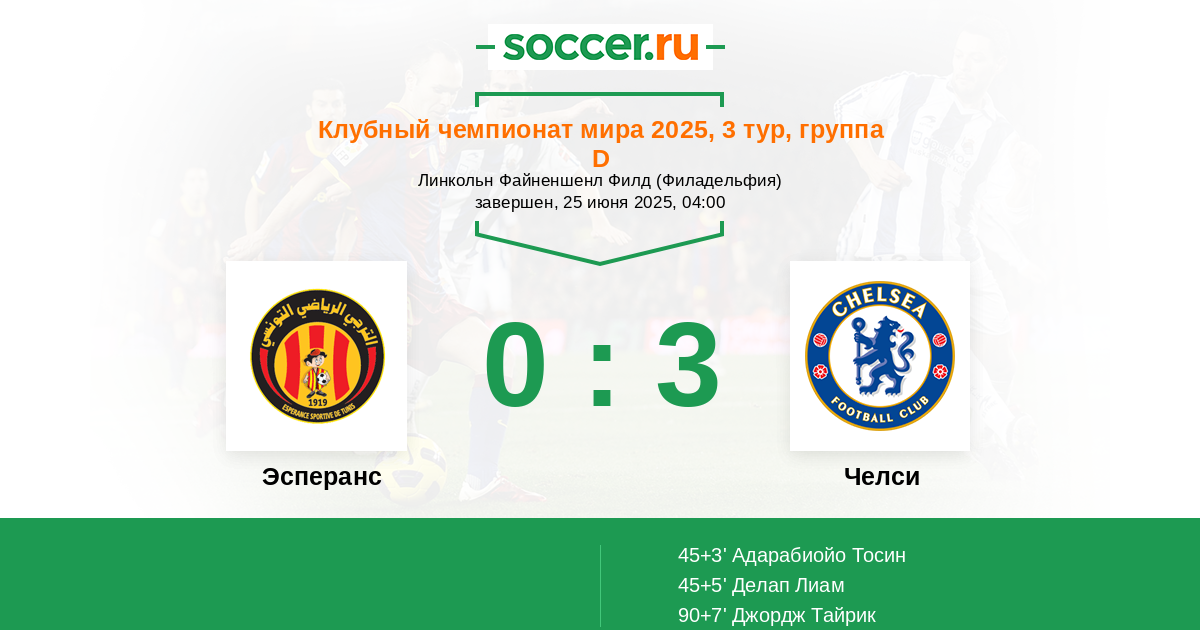 В предстоящем матче 3 - го тура нового клубного чемпионата мира по футболу 2025 года между командами Эсперанс Тунис Тунис и Челси Лондон Англия , фаворитом на победу является команда Челси