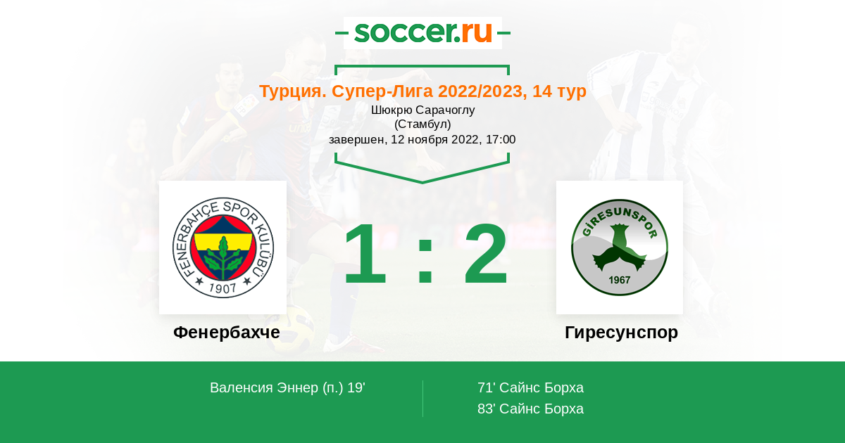 В предстоящем матче 14 - го тура турецкой Супер - Лиги между командами Фенербахче и Гиресунспор , более чем явным фаворитом на победу является команда хозяев Фенербахче , так как они главный претендент на победу в Турции в этом сезоне.