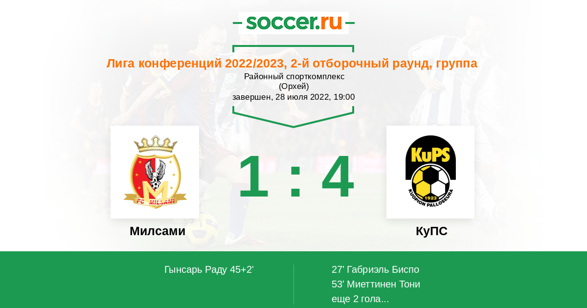 В первом матче молдавский клуб по хорошему удивил сыграв вничью в Финляндии. В ответной игре Милсами сделает всё чтобы развить успех. Поставлю на то, что молдавские футболисты не проиграют.