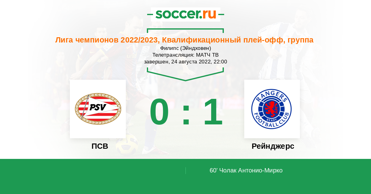 В ответном матче ЛЧ плей-офф ПСВ примет Глазго Рейнджерс . Первая встреча закончилась результативной ничьей 2 - 2 . Мне кажется нас ожидаеь такой же зрелищный и результативный поединок .