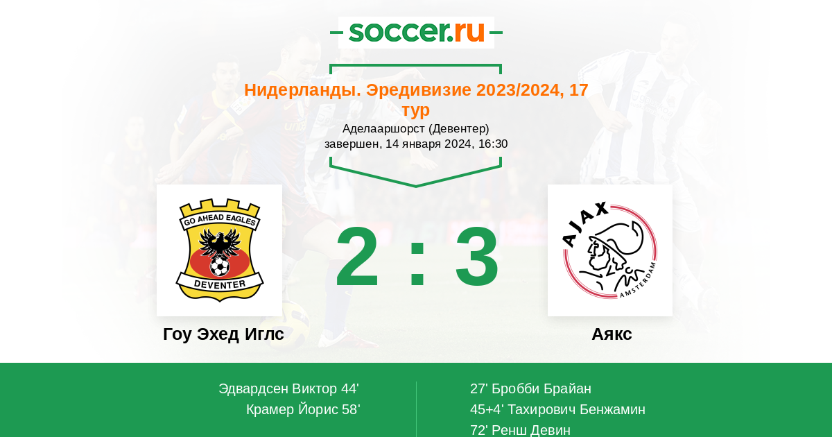 В матче голландского Эредивизие между командами Гоу Эхед Иглс и Аякс,не взирая на домашнее преимущество хозяев, смею предположить победу гостей, потому как их атака значительно результативнее, но и хозяева забьют.