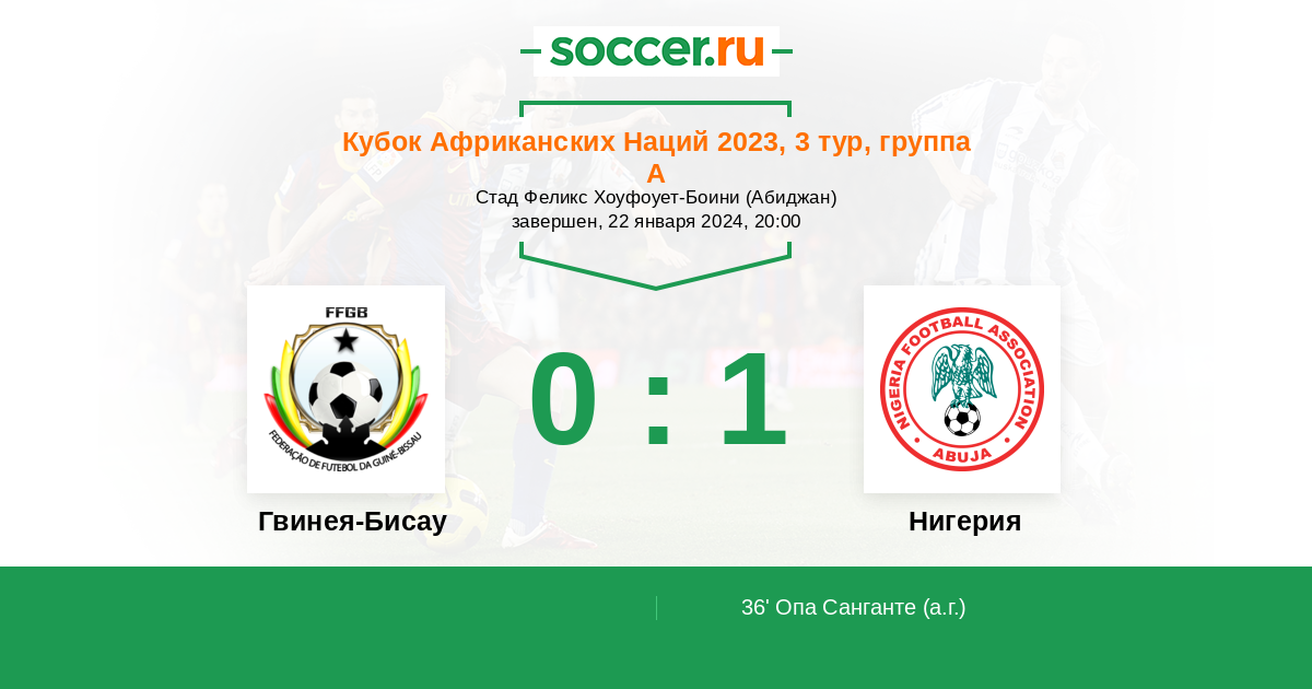 Гвинея Бисау с треском провалила два стартовых матчах турнира и фактически уже лишилась шансов на плей-офф. Вряд ли команда, которая в среднем за матч на КАН пропускает по три мяча сможет зацепиться даже за один балл, тем более против команды Нигерия, которая идет на втором месте квартета. Нигерийцы в первом туре не смогли одолеть Экваториальную Гвинею, однако далее удалось одержать успех над Кот-д’Ивуаром. Поскольку два предыдущих соперника команды Виктора Осимхена сыграют между собой, есть реальные шансы побороться за первое место группы.