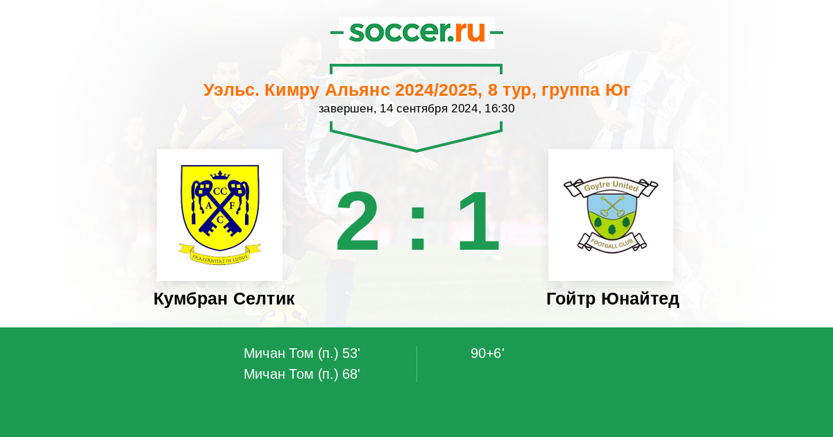Кумбран Селтик - Гойтр Юнайтед ! Результативные команды , причём как в чемпионате так и между собой . Неуступчивый характер клубов позволяет надеятся , что борьба будет вестись до самого конца встречи .