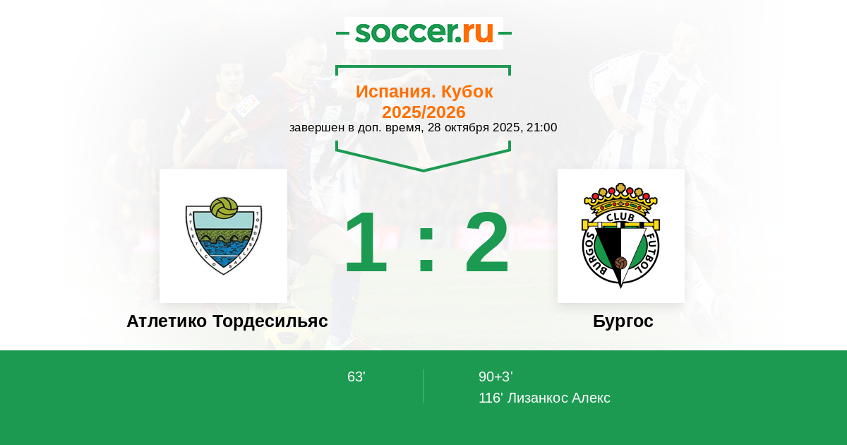 Атлетико Тордесильяс - Бургос ! Судя по статистическим данным соперники между собой ещё не встречались , но последние свои игровые отрезки провели не плохо . Кубковый матч . Упорная борьба . Ничья .