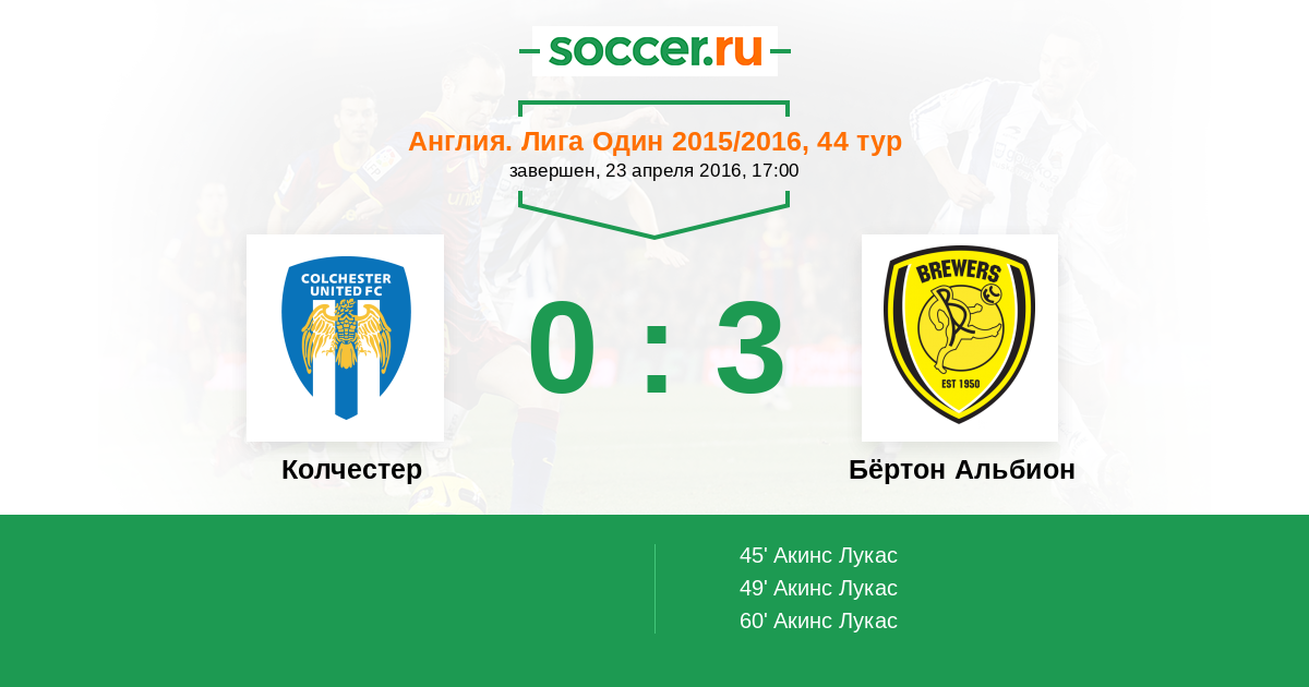 | Колчестер | 1:5 | 0:0 | 1:5 |