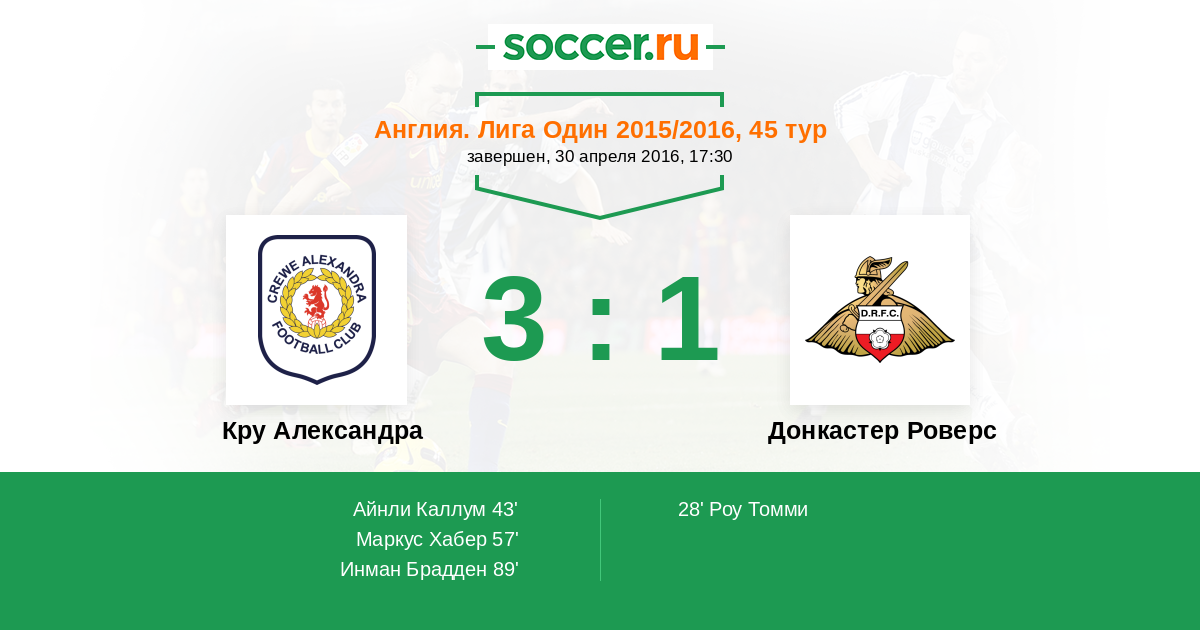 | Донкастер Роверс | 44:38 | 22:16 | 22:22 |